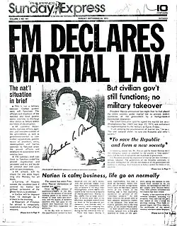 Die Verhängung des landesweiten Kriegsrechts erfolgte gemäß der Proklamation Nr. 1081, die er am 21. September 1972 unterzeichnet hatte. Dieses Recht wurde vom Präsidenten damit erklärt, um die Republik vor Rechtlosigkeit und zivilen Streit zu retten. Eine Bereiche glaubten, dass Marcos das Kriegsrecht vor dem Ende seiner zweiten Amtszeit verhängte. Die Verfassung der Dritten Republik von 1935 wurde außer Kraft gesetzt. Der Kongress wurde aufgelöst und Präsident Marcos regierte durch die Ausfertigung von Präsidialdekreten, Anweisungen und anderen Reglungen, die er als günstig für die Gesellschaft erachtete. Aufgrund des Kriegsrechts war Marcos Chef der Exekutive, der über Notstandsmacht verfügte. Der Präsident suspendierte auch die Regelung des Habeas Corpus, der fordert, dass ein Beschuldigter innerhalb kurzer Zeit einem Richter vorzuführen ist, und beschränkte die Rede-, Presse- und Versammlungsfreiheit. In der Folgezeit kam es zur Verhaftung von 50.000 Regimegegnern, Verbot der oppositionellen Presse, nächtlichen Ausgangssperren, vorübergehenden Schließungen der Schulen, Preiskontrollen sowie Verstaatlichung der Massenverkehrsmittel. Politische Gegner und Kritiker wurden festgenommen und inhaftiert. Unter diesen waren die Senatoren Ninoy Aquino, Jose Diokno, Ramon Mitra, Jr., Teofisto Guingona, Jose Nolledo, der Radio- und Fernsehkommentator Jose Mari-Velez und der Journalist Maximo Soliven.