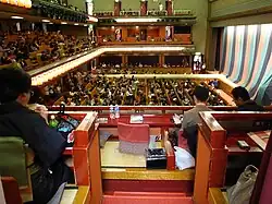Der Zuschauerraum besteht aus einem Parkett, zwei Rängen und Logenplätzen. In das Parkett hinein ragt eine laufstegförmige Vorbühne, die Hanamichi (花道, „Blumenweg“).
