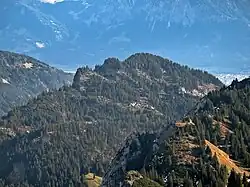 | Kackenköpfe von Jauchen. Die Spitze am linken Bildrand ist der Hohe Ifen. Unmittelbar links der Kackenköpfe sind die Oberen Gottesackerwände | ||