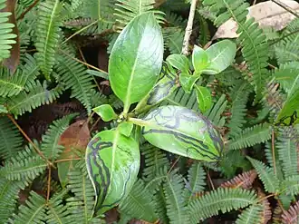 Die gegenständig an den Zweigen angeordneten Laubblätter sind in einen Blattstiel und eine Blattspreite gegliedert. Der Blattstiel ist 0 bis 1,7 Zentimeter lang. Die einfache, membran- oder papierartige Blattspreite ist bei einer Länge von 6,4 bis 16 Zentimetern sowie einer Breite von 2,6 bis 6,5 Zentimetern von verkehrt-lanzettlich über elliptisch bis verkehrt-eiförmig. Die Oberseite der Blattspreite ist kahl während die Unterseite kahl oder fein behaart ist, wobei die Behaarung manchmal nur entlang der Blattadern auftritt. Die Spreitenbasis läuft stumpf, gestutzt oder schmal zulaufend zu, die Spreitenspitze ist spitz oder kurz zugespitzt, seltener stumpf oder abgerundet und der Spreitenrand ist ganzrandig. Von jeder Seite des Blattmittelnerves zweigen mehrere eher unscheinbare Seitennerven ab. Die Nebenblätter ähneln den Laubblättern, sind mit der Basis des Blattstieles verwachsen und bilden dadurch eine Blattscheide. Die Blattscheide ist 5 bis 8 Millimeter lang.[1]