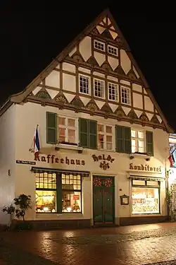 Mit dem Umbau von 1925 hob sich das Kaffeehaus Hudemann von der ortsüblichen Bebauung ab. Die neue Fassade lässt sich vom Stil her der Weserrenaissance zurechnen.[2] Ein Vergleich mit alten Stadthäusern in Einbeck, Höxter, Lemgo, Minden und anderen Städten der Weserrenaissance könnte als Beleg herangezogen werden. Befensterung wie Ausrichtung des Fachwerkes im Dachgeschoss und darüber sind für die Weserrenaissance nicht untypisch – die Fächerrosetten des heutigen Café-Heldt-Hauses finden ihre Entsprechungen an etlichen Gebäuden der Weserrenaissance-Epoche, wie zum Beispiel am Haus Litto in Höxter. Fensterläden dieses Typs wie im 1. Stockwerk trifft man hingegen eher in südlicheren Gefilden, wie unter anderen im Neckarraum oder in Mittelfranken an.