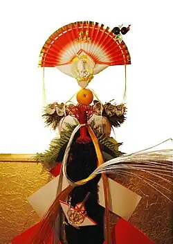 Ebenfalls zur Dekoration genutzt werden in Blitzform gefaltete Papierstreifen (shide), ähnlich denen, die an Gohei zu finden sind.