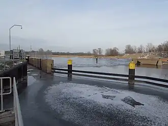 Links die Kahnschleuse im Winter talwärts im Bereich des Wehres | ||