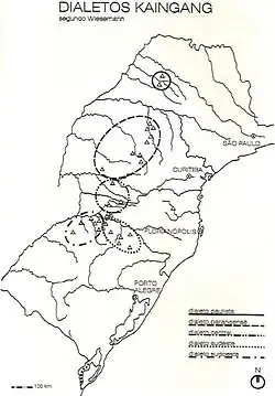 Die Sprache der Kaingang zählt gemeinsam mit der Sprache der Xokleng zu den südlichen Gê-Sprachen. Weitere Bezeichnungen sind Caingangue, Kaingáng, Kanhgág, Kainjgang, Coroados.