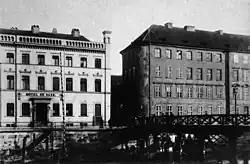 Die Verkehrsführung zwischen der Straße Unter den Linden und dem Alexanderplatz unterschied sich bis in die 1880er Jahre grundlegend von der heutigen Situation. Der gesamte Verkehr aus Richtung Unter den Linden musste ab der Schloßbrücke über die Schloßfreiheit und den Schloßplatz auf die Achse der heutigen Rathausstraße schwenken, was den zunehmenden Anforderungen an den Straßenverkehr schon lange nicht mehr gerecht wurde. Im Auftrag der Stadt und im Zusammenhang mit dem Bau der Stadtbahn entwarf August Orth 1871 den Plan für einen neuen Straßenzug in Verlängerung der Straße Unter den Linden[4] über den Lustgarten und die Spree hinweg den Berliner Stadtkern durchschneiden sollte. Um die Straße in ihrem heutigen Verlauf auszubauen, wurde ein Teil der alten, 1605 neu eingerichteten[5] Schloßapotheke gegen eine Entschädigung von 500.000 Mark (kaufkraftbereinigt in heutiger Währung: rund 3,54 Millionen Euro) abgebrochen.[6] Auch die Grundstücksbesitzer des Marienviertels entlang der Kleinen Burgstraße,[7] der Brauhausstraße,[8] der Papenstraße und am Durchbruch von der Klosterstraße über die Neue Friedrichstraße mussten entschädigt werden. Die alte, kleinteilige Bebauung, die laut damaliger Stadtplanung den Bedürfnissen einer modernen Großstadt nicht mehr entsprach, wurde niedergelegt und durch Prachtbauten (meist Geschäftshäuser) ersetzt. Für den ersten Straßenabschnitt zwischen Spree und Heiliggeist Straße wurde 1884 ein Architekturwettbewerb ausgeschrieben, den das junge Architekturbüro Cremer & Wolffenstein mit einem Entwurf in neobarocker Formensprache gewonnen hat.[9] Die beiden Ecktürme bildeten von 1886 bis zu ihrer Zerstörung eine markante Torsituation am Übergang vom Lustgarten zur Berliner Altstadt.