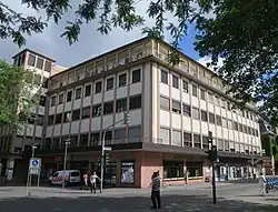 • Nr. 1 wurde als Villa für den Finanzrat Bollermann errichtet, dessen einzige Erbin seine Tochter war. Sie heiratete in die Familie Valckenberg ein, die das Haus bis zu seiner Zerstörung im Zweiten Weltkrieg nutzte.[19] Anfang der 1980er Jahre entstand das heutige Büro- und Geschäftshaus, das die einstöckige Ladenzeile aus der Nachkriegszeit ersetzte.