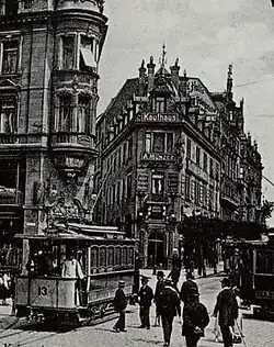 - Kaiserstraße 12 und 14 entsprach der alten Adresse Kramstraße 30. Um die Jahrhundertwende ließ der Kaufmann Ernst Haspel von A. Dederer einen Neubau planen. Dieses Haus im neogotischen Stil wurde allerdings nie errichtet. Haspel verkaufte sein Grundstück 1910 an Karl Hentges, der ebenfalls Kaufmann war und Ludwig Knortz mit der Planung des nun zu erstellenden Hauses beauftragte. Das sogenannte Hansa-Haus, ein Eisenbetonbau im Jugendstil, wurde 1911 errichtet. Rechtsanwalt Siegfried Gumbel war 1931 in der Kaiserstraße 12 ansässig.[30] Später hatte Albert Geissinger oder Geißinger dort ein Sanitätshaus; 1938 war offenbar die Victoria-Versicherung in dem Gebäude untergebracht. Schon ab Juli 1946 sollte die Ruine dieses Baus wieder als Geschäftshaus verwendet werden. 1952 befand sich das Bekleidungshaus Louis Lorenz in der Kaiserstraße 12,[31] im August richtete der Arzt Karl Pfaff darin auch eine HNO-Praxis ein.[32]