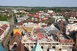 - Die Kilianskirche in der Kaiserstraße 38 ist eine gotische Hallenkirche, deren Ursprung mindestens bis in das 11. Jahrhundert zurückreicht. Ihr Westturm von Hans Schweiner gilt als eines der ersten bedeutenden Renaissancebauwerke nördlich der Alpen.[72] Die Kirche wurde wie die umliegenden Gebäude am 4. Dezember 1944 auch weitgehend zerstört, aber bis in die 1970er Jahre in ihrer ursprünglichen Gestalt wieder aufgebaut.