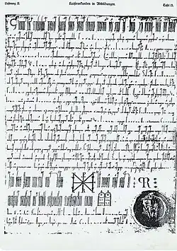 Die Kaiserurkunden in Abbildungen sind ein Tafelwerk für den akademischen Unterricht in Diplomatik und ein Hilfsmittel für kanzleigeschichtliche Untersuchungen aus der Zeit, in der weder moderne Kopierverfahren noch digitale Abbildungen im Netz zur Verfügung standen. Herausgeber waren Theodor von Sickel und Heinrich von Sybel. Das Werk erschien in elf Lieferungen ab 1880 und wurde 1891 mit der Veröffentlichung des Textbandes abgeschlossen. Die Verwendung photographischer Aufnahmen war nicht unumstritten, Gelehrte wie Julius von Pflugk-Harttung hielten das Durchpausen nach wie vor für die beste Methode.[1] 364 Urkundenbeispiele belegen die Entwicklung des äußeren Erscheinungsbildes der Urkunden der Könige und Kaiser von der Mitte des 8. Jahrhunderts (Pippin der Jüngere) bis zu Maximilian I.