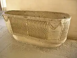 - ausgehöhlte Blöcke (sog. Rohlinge); zum Teil auch Wannen, die wohl Vorsprünge für die Ausarbeitung von Löwenköpfen hatten