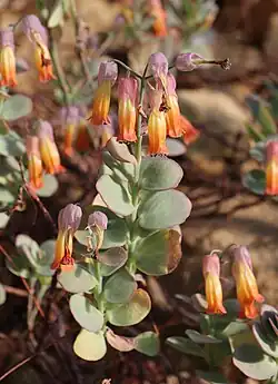Der Blütenstand ist ebensträußig, der Blütenstandsstiel 9 bis 12 Zentimeter lang. Die hängenden Blüten stehen an 10 bis 15 Millimeter langen Blütenstielen. Der Kelch ist grün bis grünpurpurn, die Kelchröhre 9 bis 11 Millimeter lang. Die dreieckigen, zugespitzten Kelchzipfel weisen eine Länge von 7 bis 8,5 Millimeter auf und sind etwa 6 Millimeter breit. Die urnenförmig-röhrige Blütenkrone ist gelb, orange bis rosafarben. Die etwas achtkantige Kronröhre ist 20 bis 35 Millimeter lang. Ihre eiförmig-dreieckigen, stumpfen Kronzipfel weisen eine Länge von 5 bis 6 Millimeter auf und sind ebenso breit. Die Staubblätter sind unterhalb der Mitte der Kronröhre angeheftet. Obere Staubblätter ragen leicht aus der Blüte heraus. Die runden Staubbeutel sind etwa 1,5 Millimeter lang. Die dreieckig-länglichen, ausgerandeten Nektarschüppchen weisen eine Länge von 0,7 bis 1 Millimeter auf und sind 1 Millimeter breit. Das gerundete Fruchtblatt weist eine Länge von etwa 6 Millimeter auf. Der Griffel ist 15 bis 18 Millimeter lang.