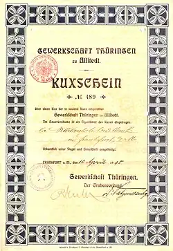 Anzahl der Kuxe: 1.000 Stück (rechts ist ein solcher Kux abgebildet).