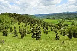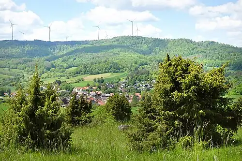 ![]() Blick aus dem Schutzgebiet auf Roßbach und die Höhen des Kaufunger Walds | ||