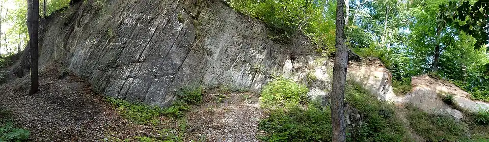 Der Aufschluss ist in etwa 10 Meter hoch und 40 Meter breit. Der Aufschluss ist ein stillgelegter Steinbruch, in dem Kalkstein gewonnen wurde. Dieser stammt aus dem Unteren Muschelkalk (Jena-Formation) einer lithostratigraphischen Einheit die der Supergruppe Germanische Trias untergeordnet ist. Dabei sind die Schichten überkippt. Vereinzelt lassen sich fossile Reste von Muscheln und Brachiopoden als auch Spurenfossilien finden. Über dem Kalkstein lagern diskordant transgressive gelbbräunliche Sande und Mergel aus der Blankenburg-Formation. Diese ist dem Unter-Campan zuzuordnen. An der Basis befindet sich eine konglomeratische Mergelbank mit Muschelkalkgeröllen, ein sogenanntes Transgressions-Konglomerat, welches sich aufgrund der erodierenden Wirkung der Meeresbrandung einstellt.