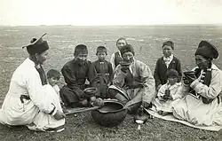 In der Sowjetunion erhielten die Kalmücken ein Autonomes Gebiet, das später zur Autonomen Sozialistischen Sowjetrepublik (ASSR) innerhalb der Russischen SFSR ausgerufen wurde. Im Zuge der Zwangskollektivierung wurden die Kalmücken zur Sesshaftigkeit gezwungen. Diese abrupte Zwangsansiedelung führte anfangs zu Hungersnöten, vom benachbarten Nomadenvolk der Kasachen starben 1932/1933 zwischen 1,3 und 1,5 Millionen Menschen. Teilweise unterstützten die Kalmücken nach diesen Erfahrungen im Zweiten Weltkrieg die einmarschierende Wehrmacht und begleiteten sie auf ihrem Rückzug.[12] Auch wurde ein eigenes, aus Freiwilligen bestehendes Kalmückisches Kavalleriekorps für die Wehrmacht aufgestellt. Die Kalmückische ASSR wurde in Vergeltung für die Kollaboration aufgelöst und die restliche kalmückische Bevölkerung am 28. Dezember 1943 nach Sibirien, Kasachstan, Usbekistan, Kirgisistan und Tadschikistan zwangsumgesiedelt.[9] Ein Drittel der Deportierten kam ums Leben. Strafdeportationen nach Mittelasien und Sibirien trafen unter Stalin auch andere sowjetische Völker, wie die Krimtataren, Karatschaier, Balkaren, Inguschen und Tschetschenen. In allen Fällen war die Zahl der gegen die Rote Armee kämpfenden Männer kleiner als die Zahl der in der Roten Armee kämpfenden Männer. Unter Chruschtschow durften die Deportierten ab 1958 in die wiedergegründete Kalmückische ASSR zurückkehren. Bei der Volkszählung 1959 lebten nur 106.066 Kalmücken.[13] Die meisten der 5.000 bis 7.000 nach Deutschland ausgewanderten Kalmücken wurden nach dem Krieg zwangsrepatriiert. 1951 befanden sich nach einer Zählung 847 Kalmücken in Deutschland und Österreich[9], wovon ein Großteil zwischen Dezember 1951 und April 1952 in die USA, vor allem nach Philadelphia und New Jersey, emigrierte.[14]