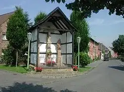 Die Kreuzigungsgruppe wurde im Jahre 1763 erbaut. Die aus Nideggener Rotsandstein gearbeitete Figurengruppe hat einen „schützenden“ Fachwerkumbau. Dieser Schutz hat der aggressiven Luft der letzten Jahrzehnte keinen Widerstand leisten können.
