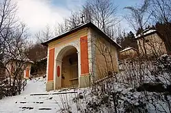 Die Anlage mit sieben Stationen bilden eine Urlauberkapelle, vier Kreuzwegstationen, die Kreuzigungsgruppe und die Grabkapelle.
