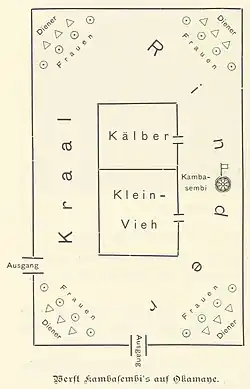Kambazembi war ein Gegner von Landverkäufen, führte bis zu seinem Tode die traditionelle, nomadisierende Lebensweise seiner Ahnen fort und weigerte sich europäische Kleidung zu tragen. Nach seinem Tode wurde das Stammesgebiet unter seine Söhne David Kaunjonjua und Salathiel aufgeteilt. David Kaunjonjua wurde Chief des Waterberg-Gebietes, Salatiel übernahm den Rest des Landes.[6] Nach dem Herero-Aufstand 1904 ging Salatiel ins Exil nach Angola, David ging ins Exil nach Botswana.