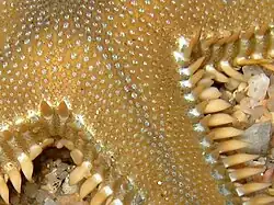 1. Hautkiemen (Papulae) 2. Paxille 3. superomarginale Randstacheln 4. superomarginale Platten 5. Schuppen und kleine Dornen auf der vertikalen Seite der superomarginalen Platten 6. Ambulacralplatten 7. adambulacrales Muster 8. inferomarginale Platten 9. inferomarginale Dornen 10. Pedicellarien 11. äußere adambulacrale Dornen 12. mittlere adambulacrale Dornen 13. innere adambulacrale Dornen 14. Ambulacralfüßchen