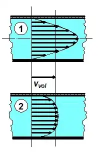 Im laminaren Fall () bildet sich ein parabelförmiges Profil aus. Für höhere Reynoldszahlen () geht die Strömung in eine turbulente Kanalströmung über, wobei das mittlere Strömungsprofil kastenförmiger wird. Der Strömungswiderstand nimmt dann gegenüber dem laminaren Fall zu, da die hinzutretenden turbulenten Schubspannungen für größeren Impulstransport in lateraler Richtung (im Folgenden: „y-Richtung“) sorgen.