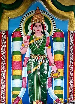 Die Verehrung von Kannaki Amman beinhaltet ihre Identifikation mit der Regengöttin der Dravidische Volksreligion Mariamman.[14] Das Cilappatikāram erklärt, dass Mariamman keine andere als Kannaki ist, indem er angibt, dass Kannaki Madurai am Freitag des Ādi-Monats verbrannte,[15] der in Tamil Nadu als Monat der Verehrung von Mariamman gilt.