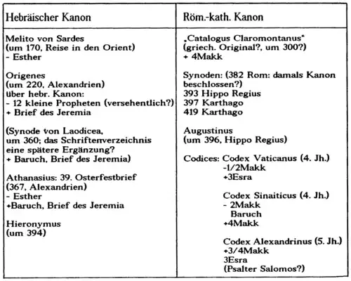 - ↑ Franz Stuhlhofer: Die altkirchliche Kanonsgeschichte im Spiegel evangelikaler Literatur. In: Gerhard Maier (Hrsg.): Der Kanon der Bibel. Brunnen, Gießen 1990, S. 165–197, das Schaubild auf S. 166.)