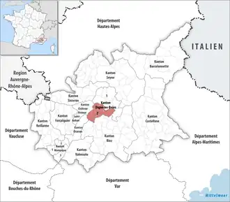 - ↑ Nur der südwestliche Teil der Gemeinde, der Rest gehört zum Kanton Digne-les-Bains-1.