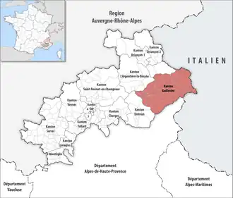 ![]() Lage des Kantons Guillestre im Département Hautes-Alpes | |