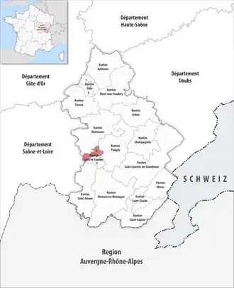- ↑ Nur der nordwestliche Teil der Gemeinde, der Rest gehört zum Kanton Lons-le-Saunier-2.