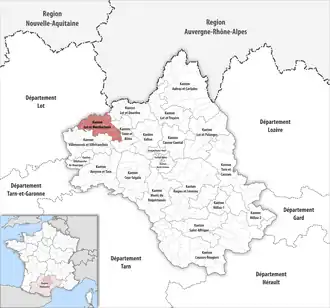 ![]() Lage des Kantons Lot et Montbazinois im Département Aveyron | |