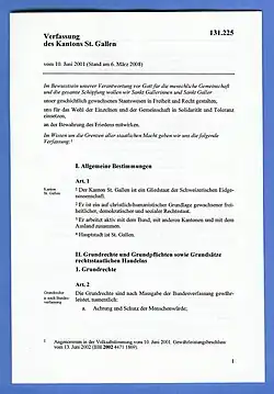 Die gegenwärtige Verfassung des Kantons St. Gallen[23] datiert vom 10. Juni 2001 (mit seitherigen Änderungen).