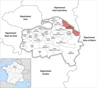 ![]() Lage des Kantons Villiers-sur-Marne im Département Val-de-Marne | |