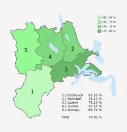 | Sursee | 54,55 % | 15'756 | 6'081 | 72,15 % | 27,85 % | Ja |