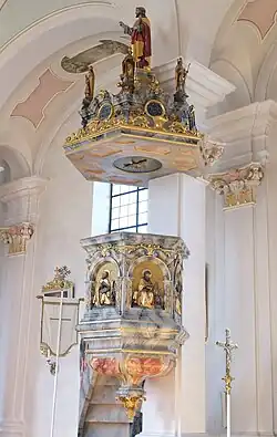 Die Kanzel aus Holz im Stil des Neubarocks besitzt einen polygonalen Kanzelkorb, in dessen vier rundbogigen Nischen Skulpturen der Evangelisten stehen. Der sechseckige Schalldeckel mit Heiliggeisttaube an der Unterseite wird von der Skulptur des segnenden Christus bekrönt. Unter ihm stehen auf dem Gesims vier kleinere Heiligenfiguren.