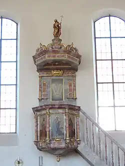 Die hölzerne Kanzel im Stil der Neubarocks besitzt einen fünfeckigen Kanzelkorb mit Gemälden der Evangelisten.