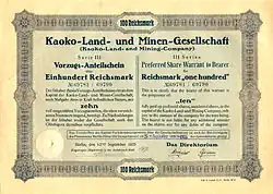 - ↑ Busso Peus: Geschichte der Kaoko-Land- und Minen-Gesellschaft. Historisches Wertpapierhaus AG, abgerufen am 6. April 2013.