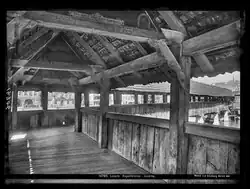 Ab dem 15. Jh. diente die Kapellbrücke auch als Ort der Geselligkeit, insbesondere durch die Installation von Bänken. Sie wurde verschönert, v. a. durch die Errichtung des historischen Bilderzyklus. Daneben wurde ihre Länge für das Gewerbe der Seilerei genutzt.[4] Es gab immer wieder Wiederherstellungsarbeiten, doch erlaubt die Quellenlage bis zum 19. Jh. nur einen lückenhaften Einblick in die Baugeschichte der Kapellbrücke. Von den Arbeiten an der Brücke sind im weiteren Verlauf besonders die beiden grösseren Renovationen von 1741/42 und 1819 zu nennen. Erstere war notwendig geworden, da nach einem Hochwasser Teile der Brücke mitsamt den darauf befindlichen Bildern eingestürzt waren.[5]