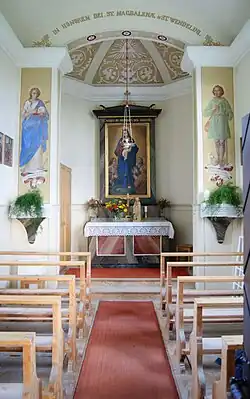 Die Kirchenbänke aus Tannenholz sind schlicht gehalten. Die Kreuzwegstationen sind kunstvolle kleine Gemälde mit Holzumrandung. Die Kapelle hat einen imposanten Hochaltar mit dem Bilde Marias mit dem Kinde mit der Inschrift: „Hl. Maria du Helferin der Christen“. Vor dem Hochaltar steht ein massiver Altar aus Holz. Neben dem eingezogenen Chorbogen sind zwei Bilder von Maria Magdalena und dem hl. Wendelin aufgemalt, die auch die Patrone dieser Kapelle sind. Die Ausgestaltung des Innenraumes oblag dem Kunstmaler Johann Kaspar Rick, der das Deckengemälde, die Darstellung Jesus im Tempel, der hl. Maria Magdalena, des hl. Wendelin, die Kreuzwegbilder sowie das Auge Gottes und die Akanthusranken sowie das Altarbild geschaffen hat.[4]