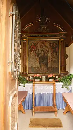 Die zwei Kirchenbänke aus Tannenholz für maximal je drei Personen sind schlicht gehalten. Die Kreuzwegstationen sind kleine Gemälde. Die Kapelle hat einen Altar aus dem Jahr 1749 mit dem Bilde Marias mit dem Kinde mit einer Rosenkranzumrandung versehen. Inschrift oberhalb: „O, heilige Maria, Mutter Gottes, bitt für uns arme Sünder! Amen.“. Im unteren Bildbereich findet sich die Stifterfamilie kniend.[2]