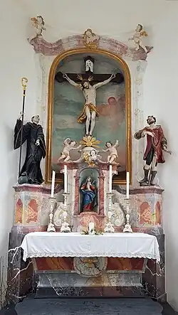 Am Altar stehen neben dem zentralen Kruzifix Figuren der „Bauernheiligen“ Leonhard (links) und Isidor (rechts). Unterhalb des Kreuzes befindet sich in einer Nische eine kleinere Darstellung der Mater dolorosa. Über der Nische schweben, ebenso wie über dem den Altar bekrönenden Bogen, zwei Putten und ein Seraph.[4]