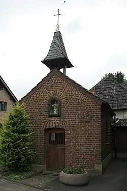 Inschriftliche Datierung: „ANO 1884“. Darüber eine Mauernische mit der Figur des Hl. Petrus (Holz, Mitte 19. Jahrhundert), erkennbar an den Schlüsseln in seinen Händen. Der Giebelabschluss betont durch holländische Dreiecke und einen mit Schiefer gedeckten Dachreiter für die Glocke. Auf der Spitze ein Kreuz mit Wetterhahn. An den Traufseiten je zwei stichbogige Fenster mit Gussrahmen. Ziegeleindeckung auf dem Dach.