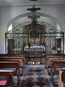 Der Betraum und Altarraum sind voneinander durch einen Chorbogen abgegrenzt. Der Boden ist teilweise schachbrettartig mit ockergelben und dunkelgrauen, hochgestellten Fließen ausgelegt, wobei der Chorraum vom Betraum durch den Chorbogen und ein massives Metallgitter deutlich abgegrenzt wird.