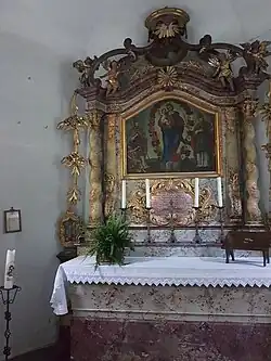 Der barocke Altar mit dem wundertätigen Gnadenbild aus der Mitte des 18. Jahrhunderts zeigt die Rosenkranzkönigin mit dem Jesuskind auf dem Arm. Links und rechts sind die Bauernheiligen St. Martin und Eligius von Noyon (St. Loy) abgebildet.