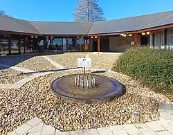 Der Vorplatz des Begegnungshauses erinnert strukturell an die Piazza del Campo in Siena und ist passend zum Gebäude ebenfalls in fünf Segmente eingeteilt, die mit einer Betonpflasterung eingefasst und mit Rollkies gefüllt sind. Er bildet den Übergang zwischen dem Begegnungshaus, dem Weiher und der offenen Seite der Kapelle. Herzstück des Vorplatzes ist ein Brunnen nach Entwürfen von André Blank mitten im Boden. Im Zentrum des Brunnens hat Blank das Bildnis der Katharina von Siena aufgetragen sowie am Außenrand des Brunnens die Inschrift „Fontana Santa Caterina da Siena, AD 1981“ eingraviert.
