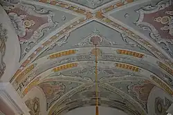 Die spätbarocken Fresken wurden 1761 von Thomas Valtiner als illusionistischer architektonischer und ornamentaler Stuck ausgeführt. Im Chor befindet sich eine Darstellung der Maria vom Siege auf Weltkugel mit Schlange umgeben von sechs Grisaillen mit symbolischer Darstellung der Lauretanischen Litanei (elfenbeinerner Turm, goldenes Haus, Arche des Bundes, Pforte des Himmels, Morgenstern, kostbares Gefäß).