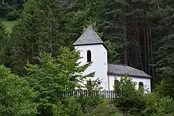 Die Kapelle wurde über rechteckigem Grundriss errichtet und ist nach Osten ausgerichtet. Sie besitzt eine rondellartige Vorhalle und einen schräg gestellten, massiven Turm. Die Außenwände sind in weiß verputzt, die Dächer schindelgedeckt. Während die eigentliche Kapelle ein ostseitig abgewalmtes Satteldach über flacher Hohlkehle besitzt, wurde die Eindeckung des Vorraums als Pultdach ausgeführt. Der Turm erhielt ein Zeltdach mit Kugel und Kreuz sowie rundbogige Schallfenster. Die nach Westen offene Vorhalle besitzt eine Sitzbank und quadratische Fenster. Die angrenzende Wand zum Kapellenraum wurde durch ein rechteckiges Fenster durchbrochen. Der Eingang erfolgt durch ein Rechteckportal durch den Kapellenturm.