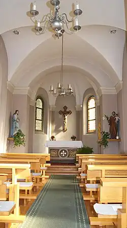 Der Betraum und Altarraum sind voneinander durch einen Chorbogen abgegrenzt. Der zweijochige Betraum weist ein Stichkappengewölbe auf. In der Fassade befinden sich Glasfenster, die am Rand farbige Elemente enthalten. Im Betraum finden etwa 30 Gläubige Platz.