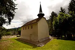 Der schlichte Grundriss besteht aus einem rechteckigen Schiff mit einer Apsis, die von einem Dachreiter überhöht ist. Die Apsiskalotte ist mit bedeutenden Wandmalereien ausgestattet. Der segnende Christus in der Aureole (sogenannter Maiestas Domini) wird von den zwölf Aposteln von den vier Evangelistensymbolen umgeben. Im Scheitelpunkt des Triumphbogens ist der bartlose Christus in einem Medaillon dargestellt. Links opfert Abel ein Lamm, rechts hält Kain eine Ährengarbe.