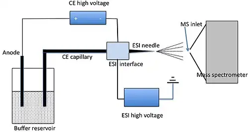 Die ursprüngliche Schnittstelle zwischen Kapillarzonenelektrophorese und Massenspektrometrie wurde 1987[4] von Richard D. Smith und Mitarbeitern des Pacific Northwest National Laboratory entwickelt, die später auch an der Entwicklung von Schnittstellen zu anderen CE-Varianten beteiligt waren, darunter Kapillar-Isotachophorese und kapillar-isoelektrische Fokussierung.
