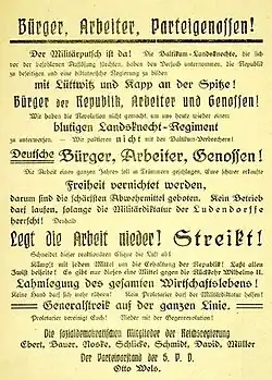 „Arbeiter! Genossen! Wir haben die Revolution nicht gemacht, um uns heute wieder einem blutigen Landsknechtsregime zu unterwerfen. Wir paktieren nicht mit den Baltikumsverbrechern! … Es geht um Alles! Darum sind die schärfsten Abwehrmittel geboten. … Legt die Arbeit nieder! Streikt! Schneidet dieser reaktionären Clique die Luft ab! Kämpft mit jedem Mittel für die Erhaltung der Republik! Lasst allen Zwist beiseite. Es gibt nur ein Mittel gegen die Diktatur Wilhelms II: Lahmlegung jedes Wirtschaftslebens! Keine Hand darf sich mehr rühren! Kein Proletarier darf der Militärdiktatur helfen! Generalstreik auf der ganze Linie! Proletarier, vereinigt euch! Nieder mit der Gegenrevolution!“